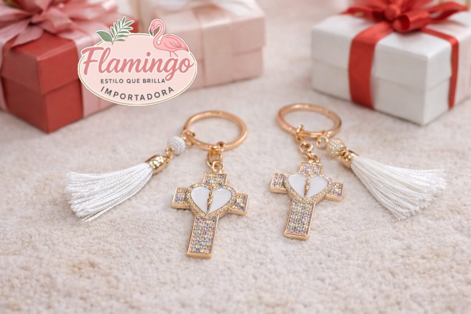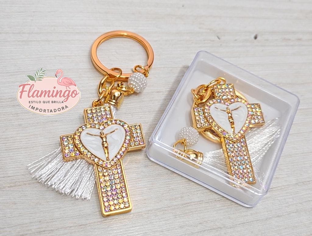 Este llavero en forma de cruz con corazón es el equilibrio perfecto entre fe, elegancia y estilo. Su acabado dorado, junto a cristales brillantes y detalles delicados, lo convierten en un accesorio sofisticado y lleno de significado.